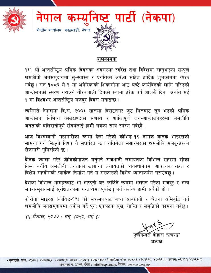 १३१ औं अन्तर्राष्ट्रिय श्रमिक दिवसका अवसरमा प्रचण्डको शुभकामना