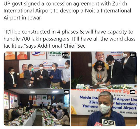 उत्तर प्रदेशमा एक बृहत अन्तर्राष्ट्रिय विमानस्थल बनाउनका लागि स्विट्जरल्यान्डको जुरिच अन्तर्राष्ट्रिय विमानस्थलसँग सम्झौता भएको छ । विश्वकै एक उत्कृष्ट विमानस्थल जुरिचले यसअघि निजगढ अन्तर्राष्ट्रिय विमानस्थल निर्माणका लागि अस्वीकार गरेको थियो ।