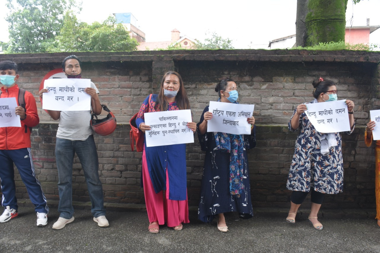 एैतिहासिक हिन्दु मन्दिर निर्माण कार्य गर्न राेक लगाएकाे प्रति घाेर भत्सर्ना गर्दै काठमाडाैँमा रहेकाे पाकिस्तानी दूतावास अगाडि प्रदर्शन गरेकाे छ।